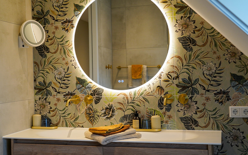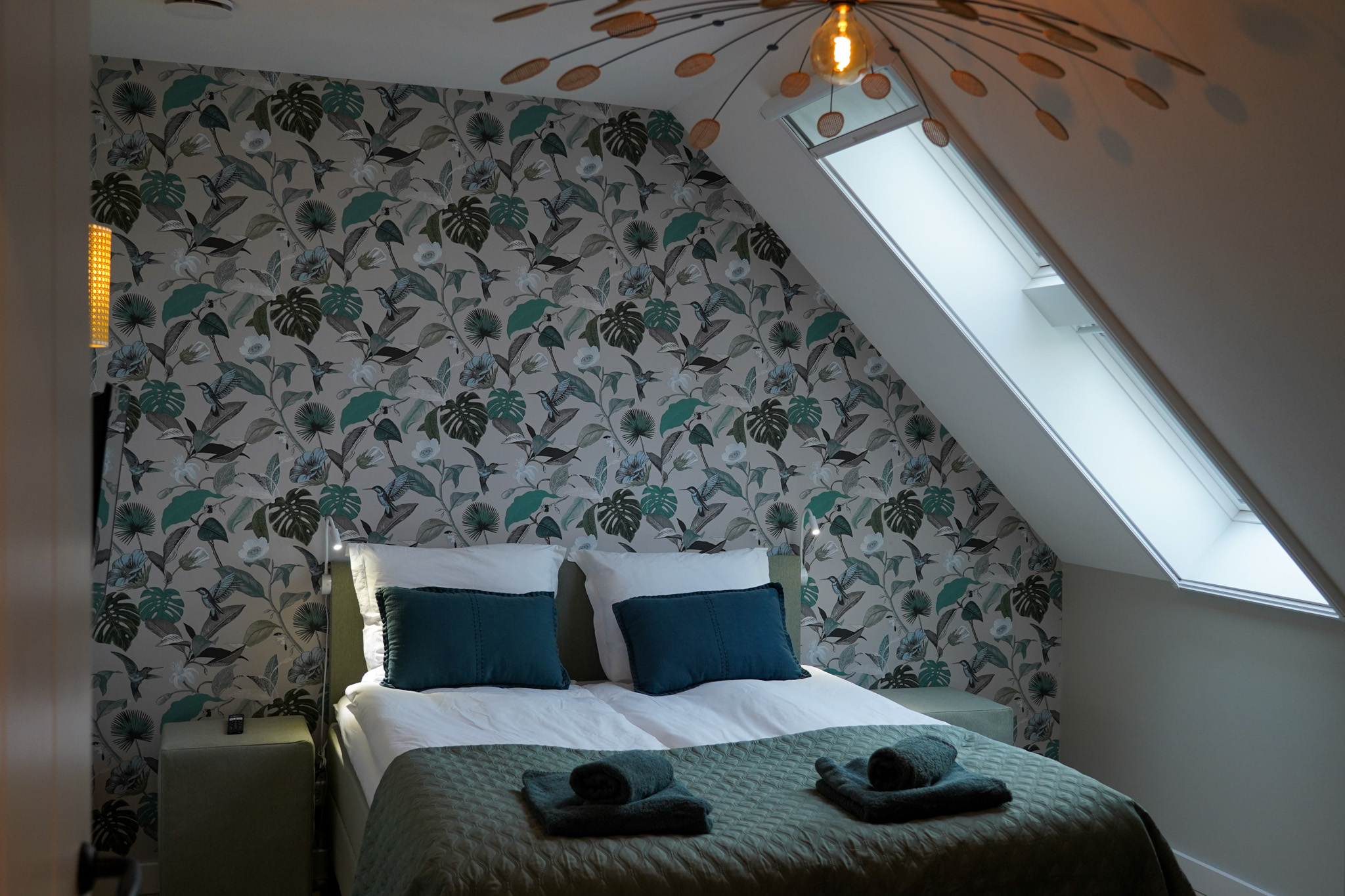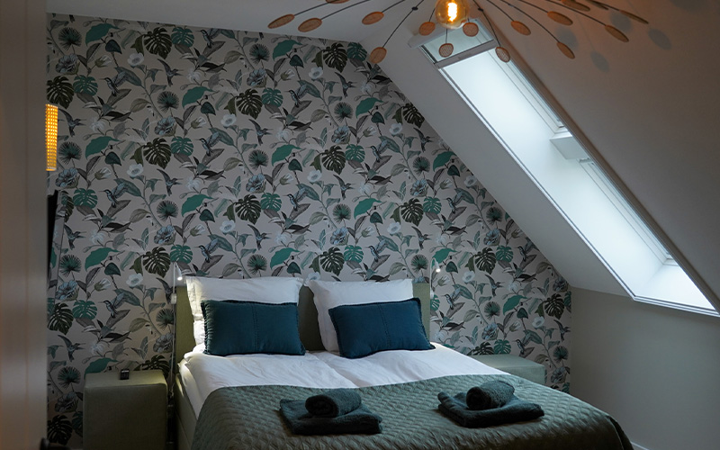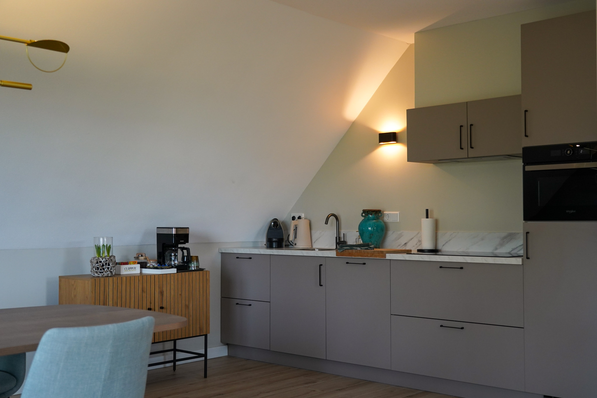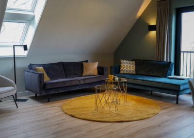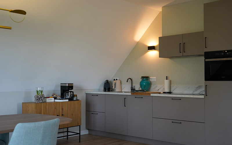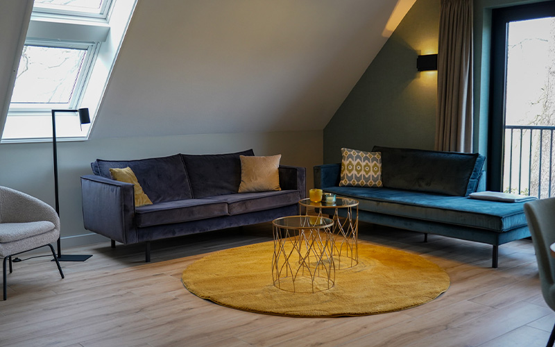 Via de eikenhouten trap in de centrale entree bereik je het ruime appartement dat de gehele bovenverdieping bestrijkt. Vanuit de lichte woonkamer heb je een prachtig uitzicht op de omliggende natuur. Het interieur is ingericht met gebruik van natuurlijke materialen en tinten.