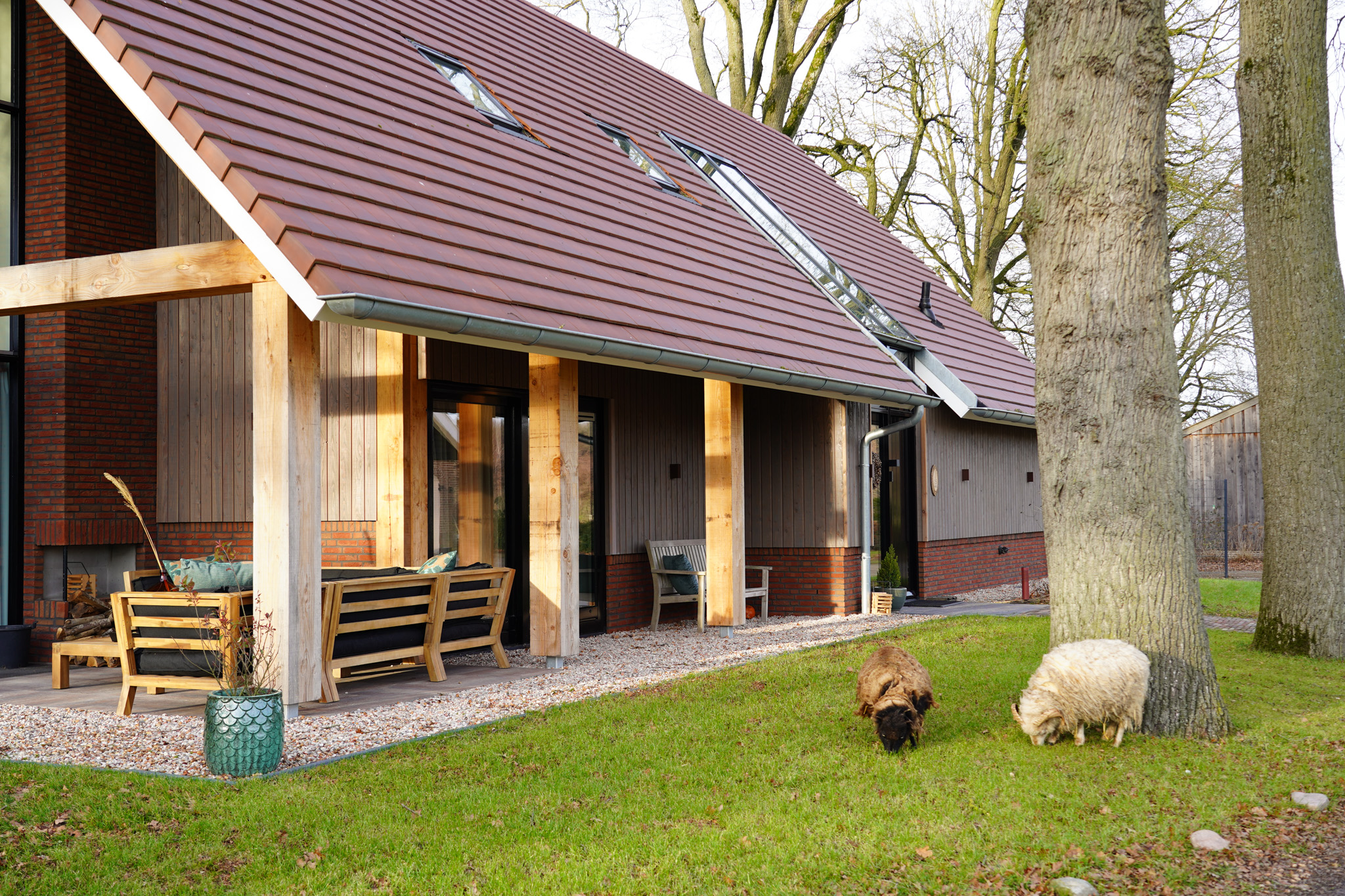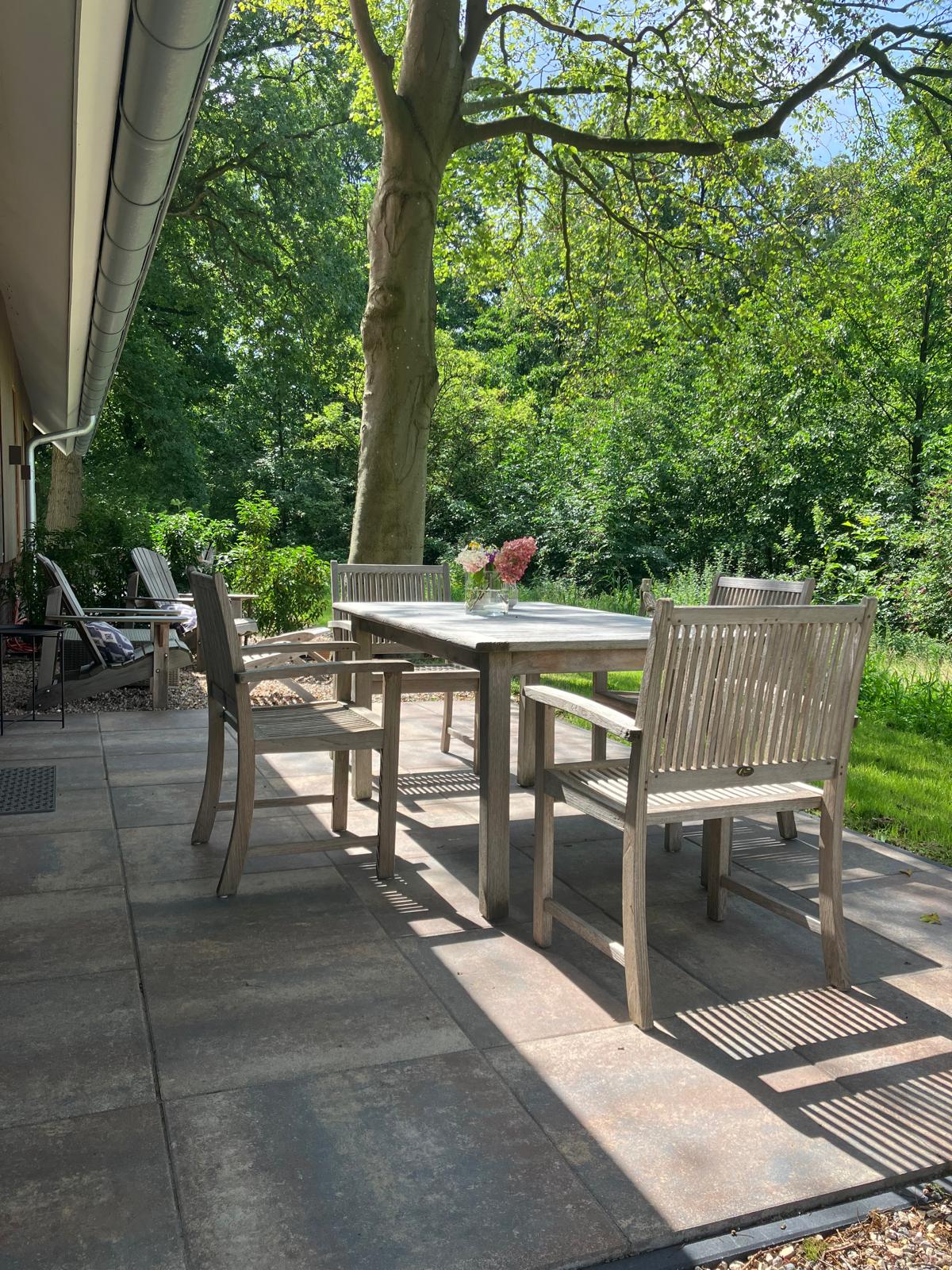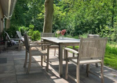 Vanuit alle ramen kijk je uit op de omliggende natuur. De woonkamer heeft een ruime schuifpui naar je eigen terras dat voorzien is van comfortabel tuinmeubilair. Hier kun je heerlijk privé van het buitenleven genieten. Voor een vuurkorf en barbecue kan in overleg gezorgd worden.